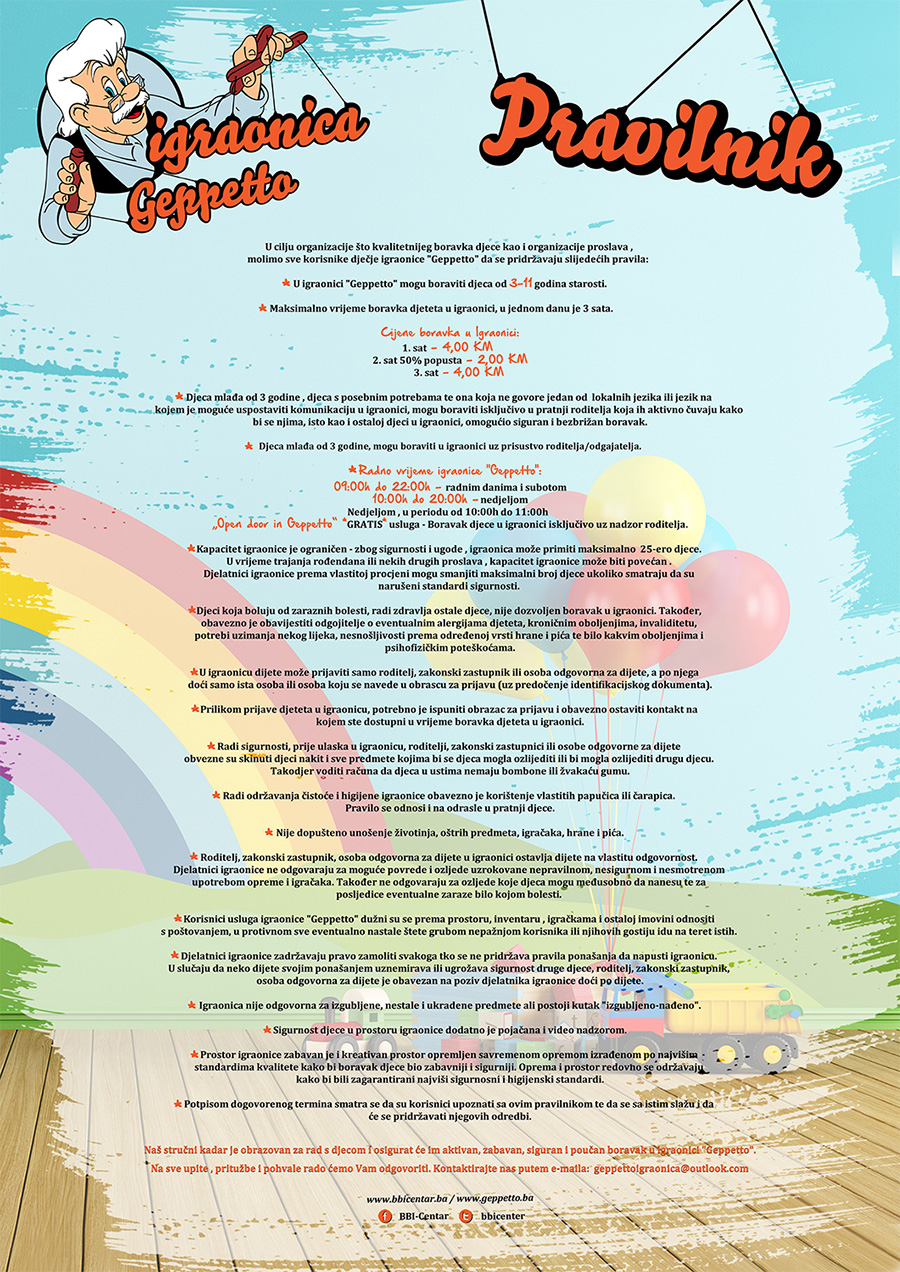 Dječija igraonica Geppetto je od svog otvaranja postala omiljeno mjesto za druženje naših mališana i njihovih roditelja. Igraonica se nalazi na petom spratu BBI Centra u Sarajevu.